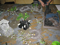 Ich konnte zuerst aufstellen und wählte die Seite, die mir die beste Deckung gab um die Nahkampffront so klein wie möglich zu halten. Nach dem ersten Zug war die Formation geschlossen und bereit. Dann machten wir einen Fehler...Lukas verrechnete sich und schockte schon im ersten Zug seine Einheiten (lediglich die Tyranten und Tervigons standen auf dem Spielfeld), aber wir merken es beide erst nach dem Zug. Es war aber für den weiteren Verlauf nicht sonderlich wichtig...das Spiel war praktisch einen Zug vorverlegt worden.
