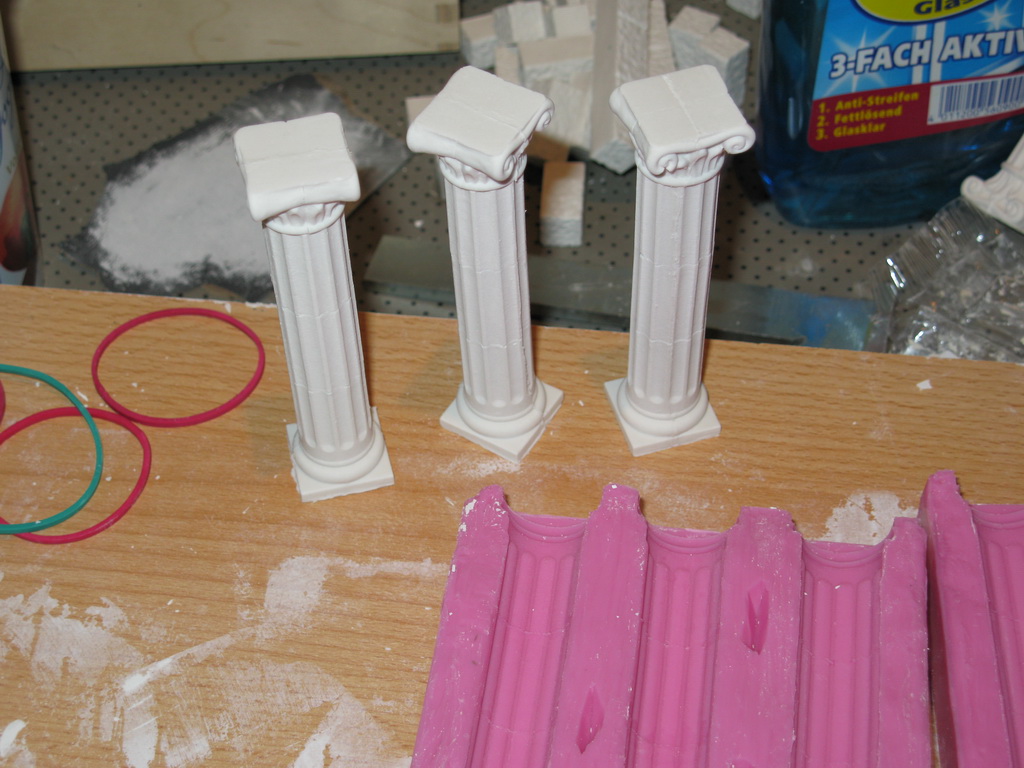Der erste Teil war der aufwendigste. Die drei Säulen wurden so genau wie möglich gebaut, alle Fehler ausgebessert und alle winkel genau gefeilt. Je schöner der Master, desto besser der Giesling. Es war klar, das jede Minute die in den Formenbau investiert wird nachher um ein mehrfaches eingespart wird.