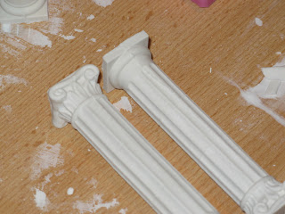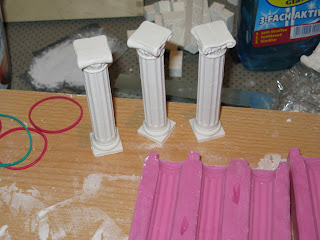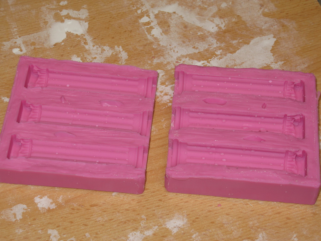 Ich nutzte mein neues Set von der Spielemesse...das "Dubliersystem von coolcone" mit der sehr nützlichen Knetmasse. In diese bettete ich die Säulen bis zur Hälfte. Nachdem die Masse so gut als möglich geglättet war kamen die vier Trennwände rundum. Abdichten und die erste Hälfte der Form giessen. Das Ergebnis dieses Gusses könnt ihr im ersten Bild sehen.