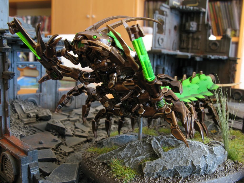 Und Earthworm Jim (danke Stefan, den Namen wird er nicht mehr los), mein Tombstalker hatte mich lange genug böse angesehen. Nach einem lehrreichen Ausrutscher mit Flüssigkrepp (niemals auf detailreichen Modellen mit Hinterschneidungen anwenden!) war ich leicht gefrustet, aber nun wurds Zeit und ich hab ihn nach einer kompletten Demontage neu gesprüht und gebased. Hier mal die Bilder vom aktuellen Stand: