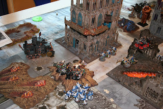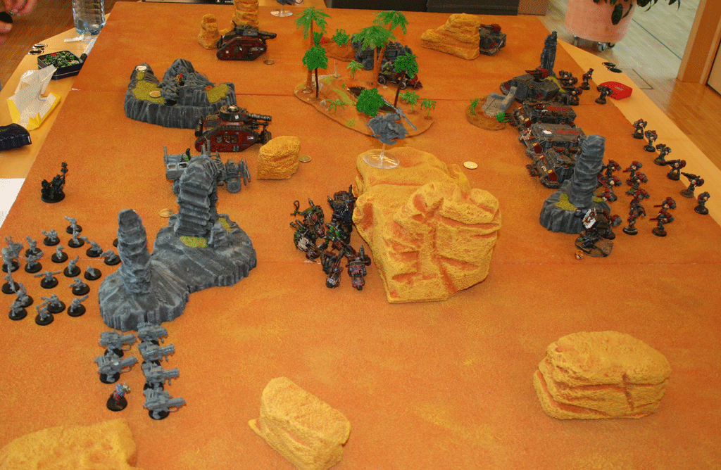 Hartels Carpe Noctem.. 40 Chaosmarines in Rhinos, 3x2 Kyborgs, Cybot und ein General mit Flügeln und ein Dämonenprinz.. gespielt auf der Stadtmap.. der erste Zug ging an Hartel. Ich konnte alle meine Rhinos super verstecken und musste nur den Verlust einens Raketenwerfers beklagen. Was für ein seltsames spiel.. wir beide waren sehr vorsichtig.. anstatt sofort vorzupreschen gab es Distanzschiesen um die Rhinos zu knacken und sich in eine bessere position zu bringen.. oben in den Gebäuden lauterten der DP, der General mit Flügeln bzw. meine Skyclaws um sich auf den erstbesten Trupp zu werfen der da aus einem Rhino herausgeschossen wird.. während die ersten 2-3 runden wie im flug vergingen, weil nicht allzuviel passierte ging es dann schlag auf schlag.. die Cybots löschten sich gegenseitig aus.. Rhinos explodierten, die Manschaften beschossen oder prügelten sich gegenseitig.. Die Skyclaws wie auch der General und der Dämonenprinz griffen ein... nachdem die 5 runde, und auch das Spiel gelaufen war.. stand es 2:1 für mich..