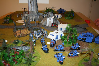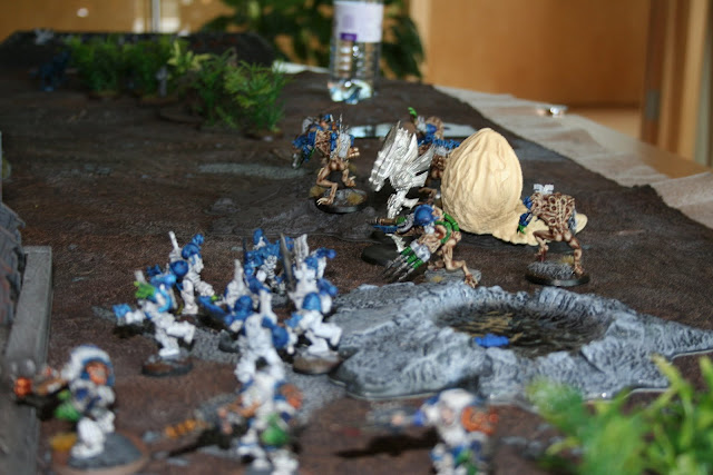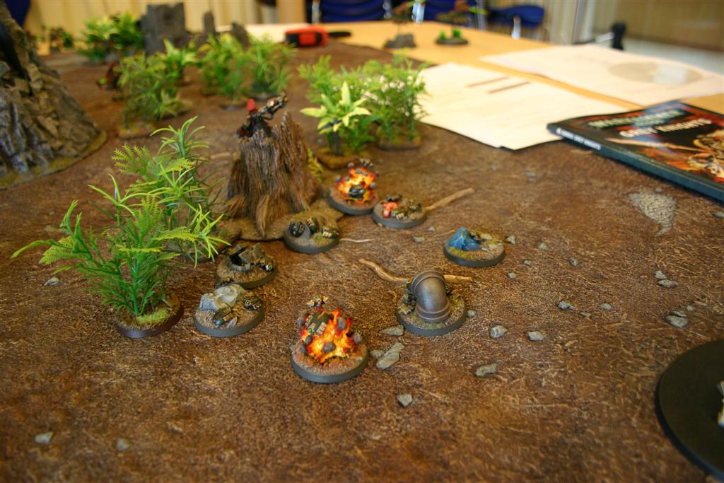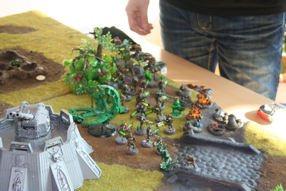 Aufgestellt wurde auf Seiten der Tyras ungefähr folgendes: 1 x Dakka-Schwarmtyrant mit Leibwachen, 2 x Dakka-Fex, 2 x große Trupps Termaganten, 3 x Trupps Symbionten, 1 x nervende-Nemessis, 1 x Alpha-Trygon, 1 x Warpblitzschleuder, 3 x Schwarmwache. Gespielt wurde auf der Ruinen/Dschungel Platte.