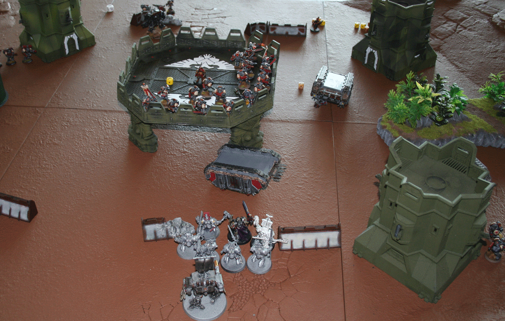 Christian kam mit einer kleinen Footslogger Armee, ~25-30Modelle geführt von Draigo+Paladin Todesstern, die blieben jedoch zusammen mit einem Termitrupp in Reserve. Der erste Zug ging an ihn und er teleportierte 2 Abfangtrupps und einen Dreadknight direkt vor meine Linien. Meine verluste fielen bescheiden aus, und so konnte ich meine gesammte Feuer&Kampfkraft auf diese 3 Einheiten konzentrieren die dann auch innerhalb kürzester zeit ausgelöscht wurden. In den darauf folgenden Runden preschten meine Graumähnen vor, verloren unterwegs ihre Rhinos, und besetzten das Zentrale Missionsziel und als Driago mit seinen Hommies endlich über den Plattenrand latschten wurden sie durch das Schnellfeuer von 3 Graumähnentrupps empfangen.