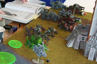 Gegen Marc und seine Orks zu spielen ist für mich immer wieder eine Freude! Er spielte 3 Pickkupmobs, 2Lootet Tanks, 2 Trupps Lootas, Bossbikamob mit Bikaboss, nem Snotzogga und nem Trupp Gretchen.
