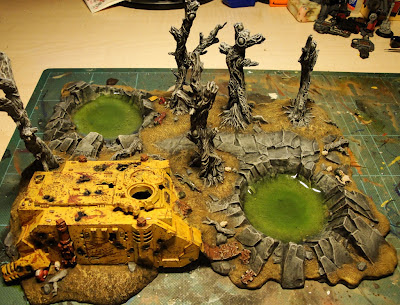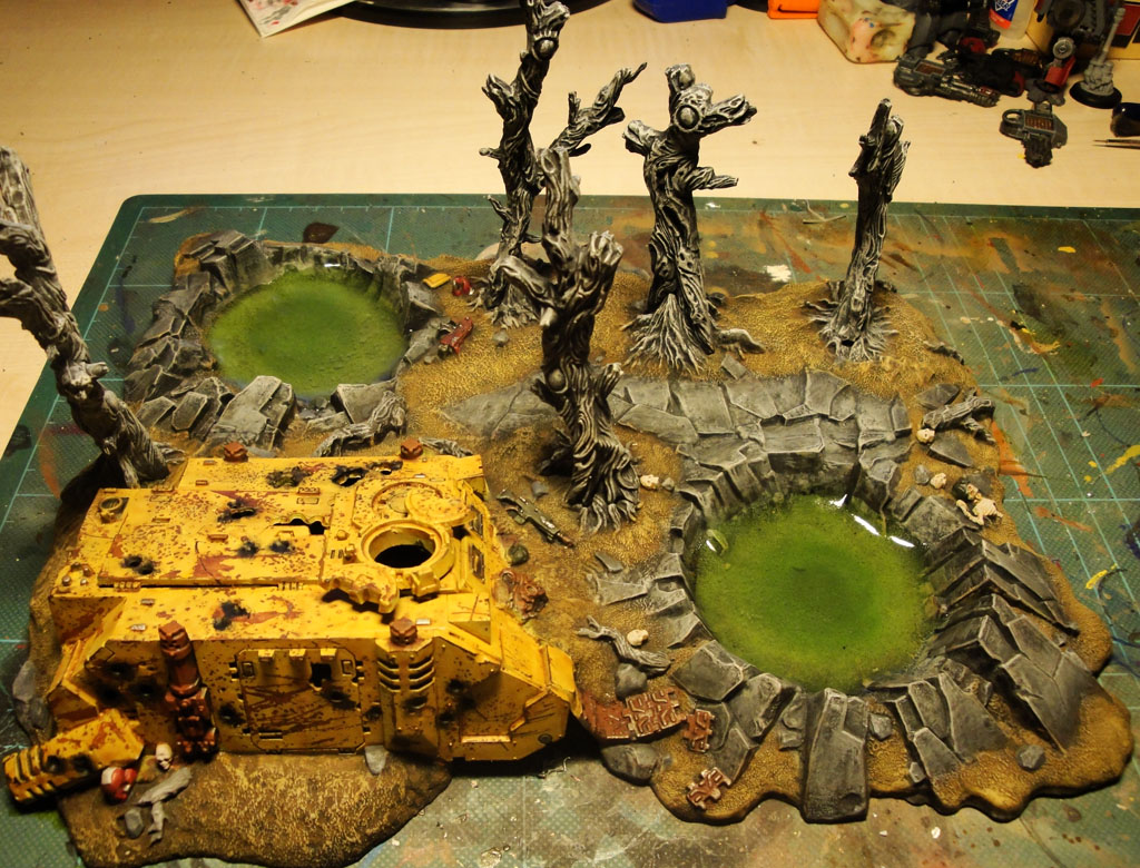 Zu guter letzt noch ein Bildchen des "Battlescape" Geländestücks von GW.. abgesehen von diesen seltsamen Steinkratern hat mir das immer schon gut gefallen.. also hab ich mich vor unserem Turnier noch mal drangesetzt und es begonnen zu bemalen.. dabei habe ich auf ein paar Dinge aus dem IA Masterclass gestützt.. Das Rhinowrack bekam nach der obligatorischen Schwarzen Grundierung zusätzlich eine Braune, wurde anschließend mit Haarspray besprüht und besalzt.. danach gabs einen ladung Iyaden Darksun per Airbrush.. danach wurde das Salz abgewaschen und mit einem Modelierwerkzeug mechanisch auf die Farbe eingewirkt, um Kratzer zu erzeugen.