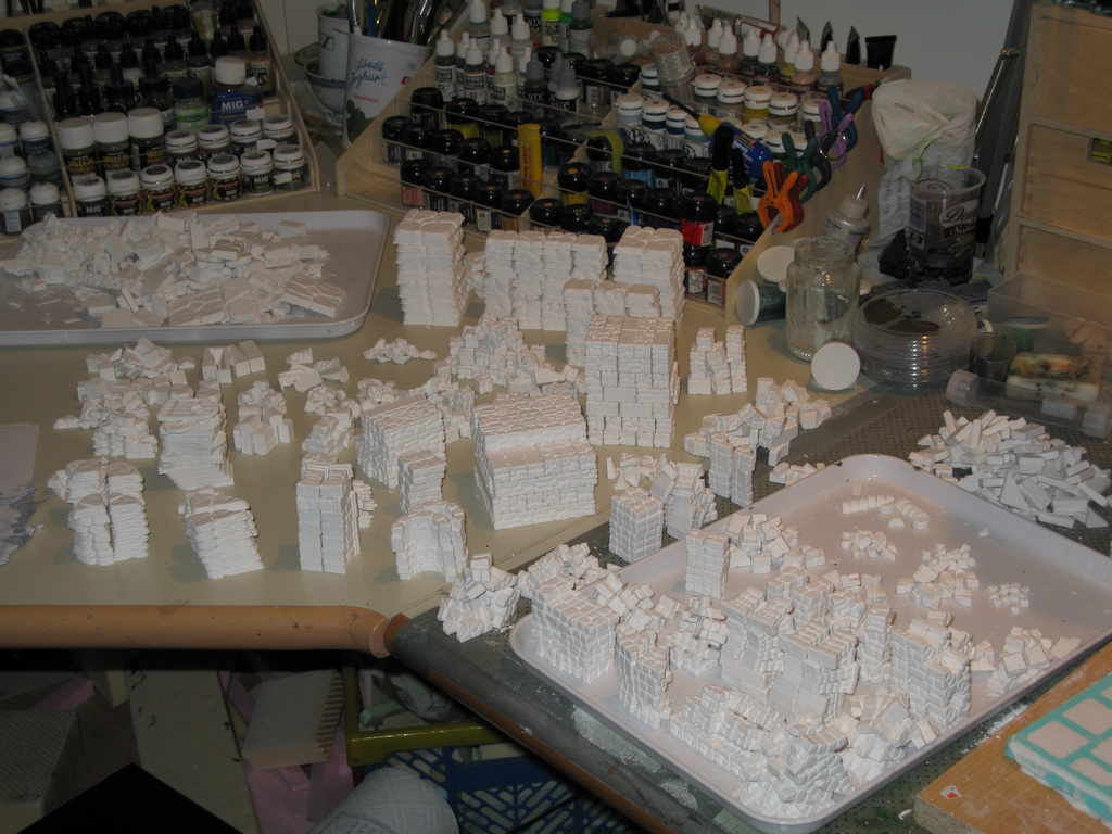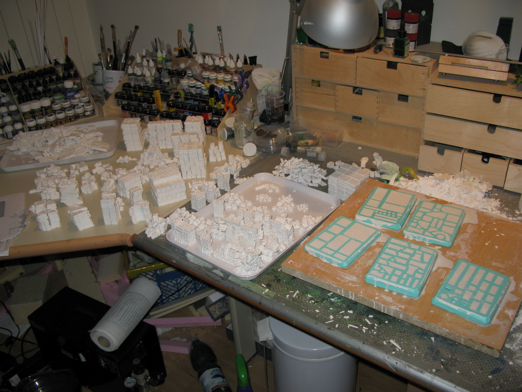 Jetzt beginnt der spassige Teil: Bauen. Ich werde mich mal vorerst grob an Bruce' Pläne halten, aber da sich schon einige seiner Formen in meiner Sammlung befinden kann ich den Bodenplatten mit vielen kleinen Detail einen Extra-kick geben. Auch unsere Warhammer Fantasy Bits box wird hier sehr gute Dienste leisten.