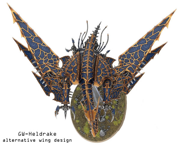 Bei 40kings hatte ich dann beim stöbern in den Artikeln ein Bild mit einem alternativen Flügeldesign vom Helldrake gesehen, das mir gar nicht schlecht gefallen hat. Wenn schon Drache dachte sich wohl der Bastler, dann richtig Drache, und ich stimme dem zu. Ich habe mich daran gesetzt und versucht das Flügeldesign nachzubauen. Leider habe ich es nicht optimal hinbekommen, mit dem Ergebnis bin ich nur mäßig zufrieden. Die Neigung der Flügel sollte nicht so steil nach unten Zeigen, eher wollte ich eine Art Gleitflug darstellen, wie gesagt leider hats so nicht geklappt.