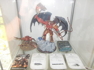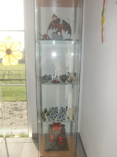 Der nächste Punkt auf der Liste ist das neue Zuhause für mein Fertigbemaltes, in letzter Zeit gibt's da ja immer mal wieder etwas davon. Da wir bei uns im Esszimmer die Vitrine ausgemustert haben, und im Treppenaufgang ein Regal entfernt wurde, meine Evi ich könnte die Vitrine ja dorthin stellen und meine Minis reinstellen. Gesagt getan, der Papadämon fühlt sich jedenfalls schon wohl :)