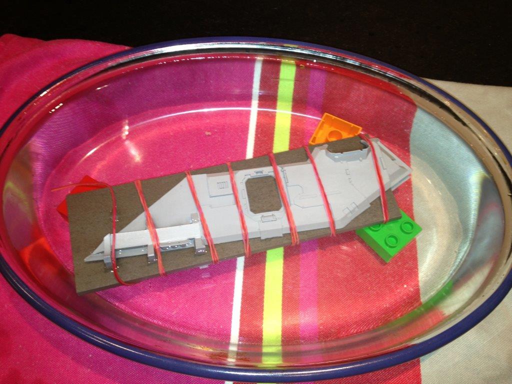 Ich hab leider kein Bild vom Originalzustand.. aber gerade die beiden Seitenteile waren ziemlich krumm und verdreht.. also habe ich die beiden Teile mit Gummis auf ein stück Fliese aufgespannt und in heissem Wasser versenkt.